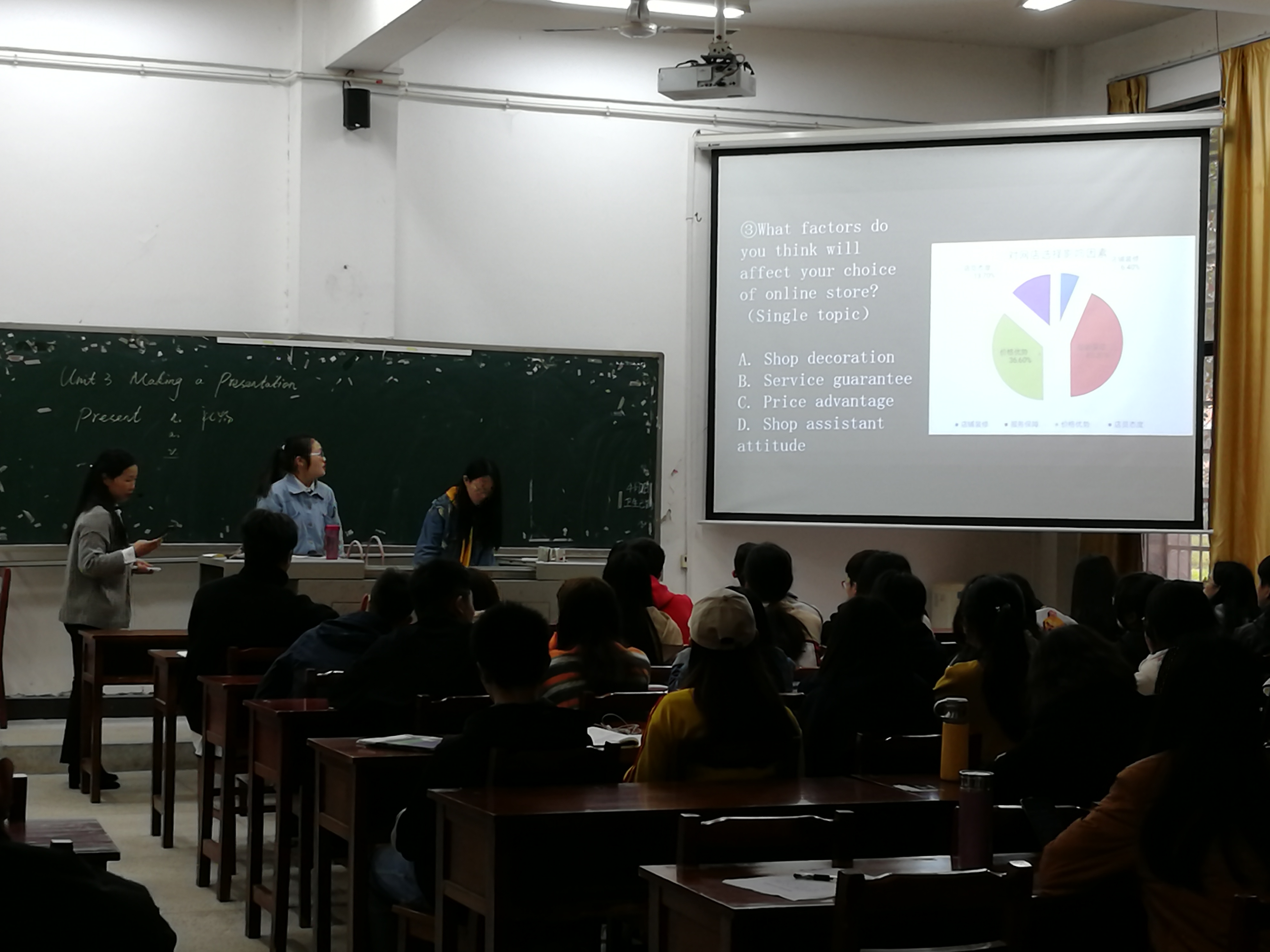 张莲老师讲授《大学英语(二)》课程的Unit 5 “Selling a Product or Service”,张老师通过每日金句赠言的方式对单词present不同词性的意义进行讲解,自然而然地引入了课程主题学习:Making an effective presentation。教学手段丰富多样,充分体现了英语课堂以学生为主导的教学理念,激发了学生的学习兴趣,课堂效果好。