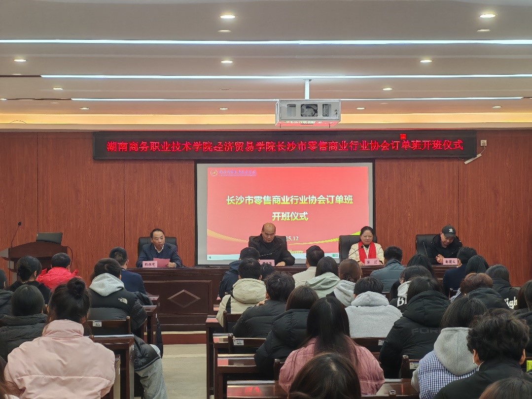 2025年12月29日,湖南商务职业技术学院经济贸易学院隆重举行“长沙市零售商业行业协会订单班”开班仪式。此次订单班的开班,是经济贸易学院深入贯彻国家关于深化产教融合、校企合作的战略部署,积极响应连锁零售行业新发展趋势的重要战略之举,是“专业+行业协会”协同合作培养连锁新零售人才的创新探索。