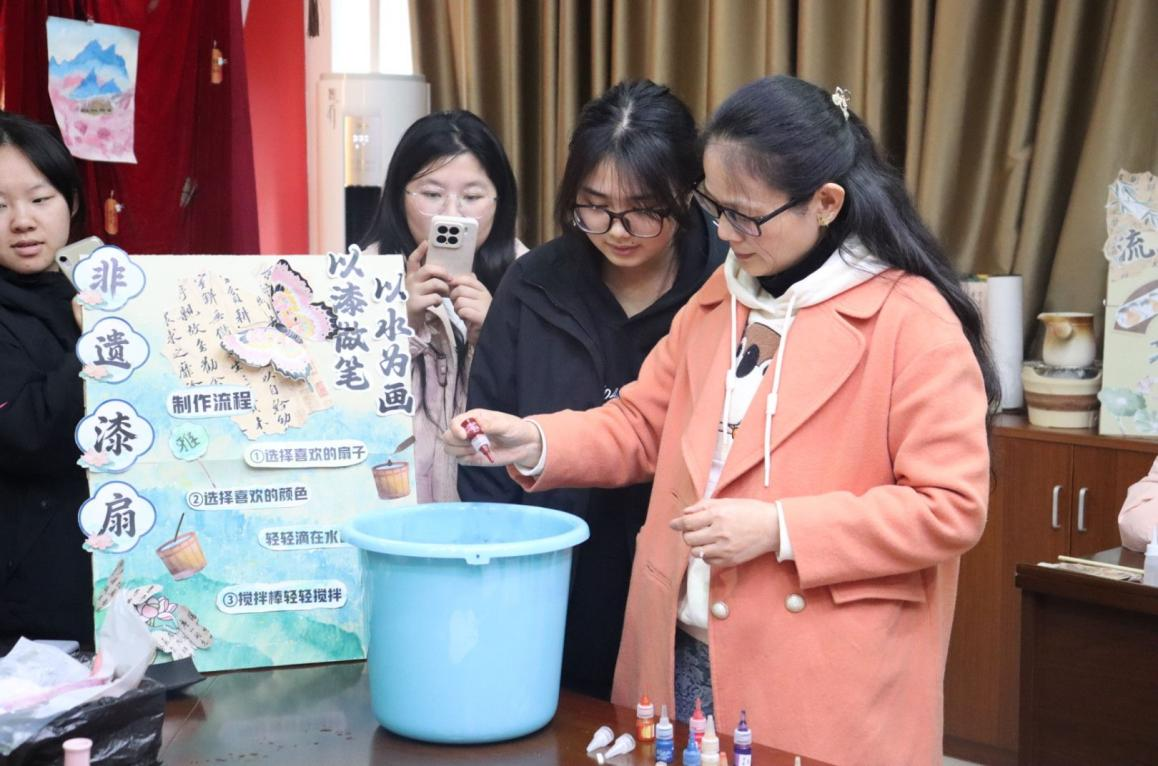 “雅韵漆扇区”人气高涨,同学们屏息凝神,观察漆彩在水面流淌交融,再小心翼翼地将扇面浸入,提起时,每一幅独一无二的流光纹样都引来阵阵惊叹。“这就像开‘非遗盲盒’,每一次都是独一无二的艺术品!”一位同学兴奋地展示着自己的作品。