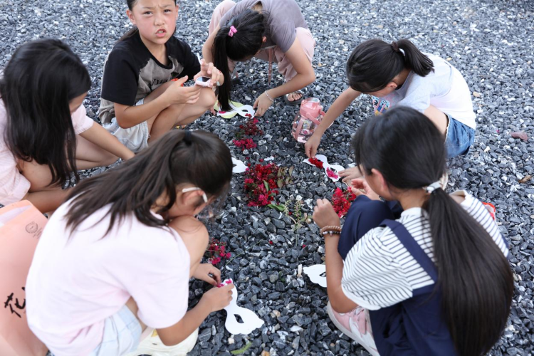 志愿者们在户外空地上指导孩子们运用刚刚采集的植物材料制作个性化面具。从植物材料的形态选择到构图拼贴,从色彩搭配到整体美感呈现,充分激发孩子们的审美创造力。孩子们将形态各异的树叶、色彩斑斓的花瓣转化为艺术元素,设计出蝴蝶、精灵等充满美感的独特作品,在动手实践中深化对自然之美的理解;同时通过分享创作中对美的思考,如 “我用红色花瓣是因为它像太阳一样温暖漂亮”“我觉得长长的叶子可以当作我们的眉毛”,深化对个性表达与自然美学的理解。