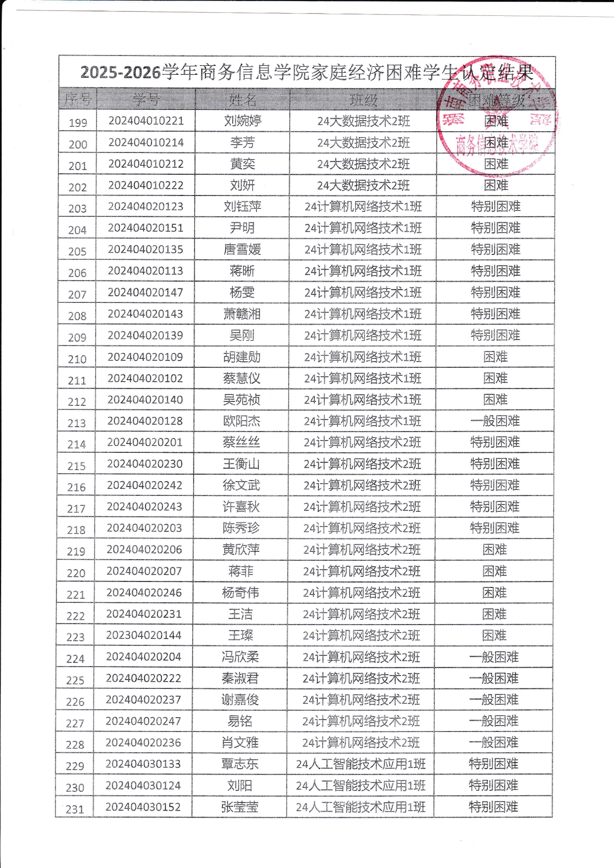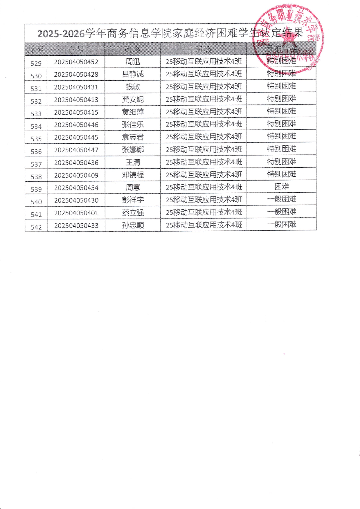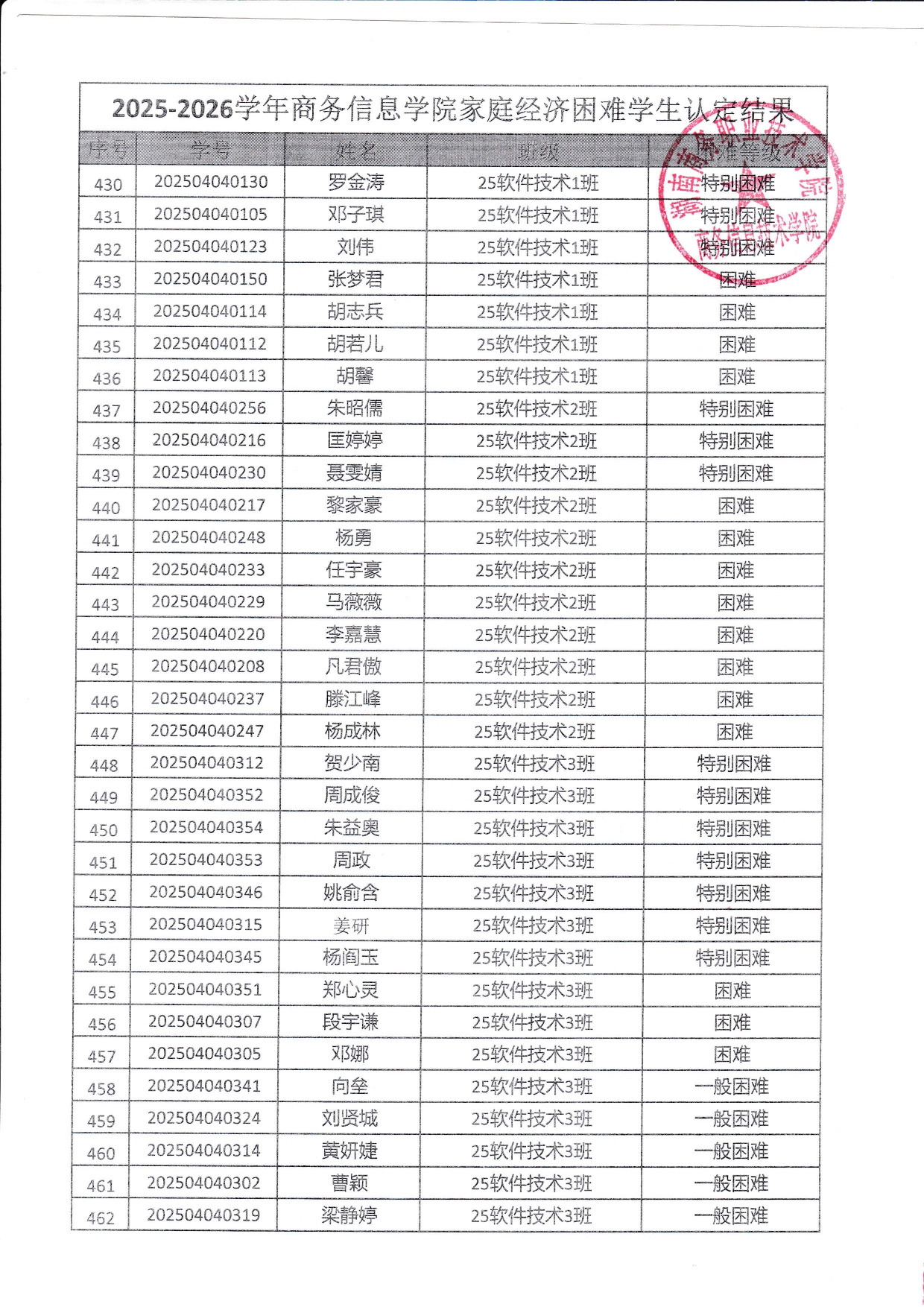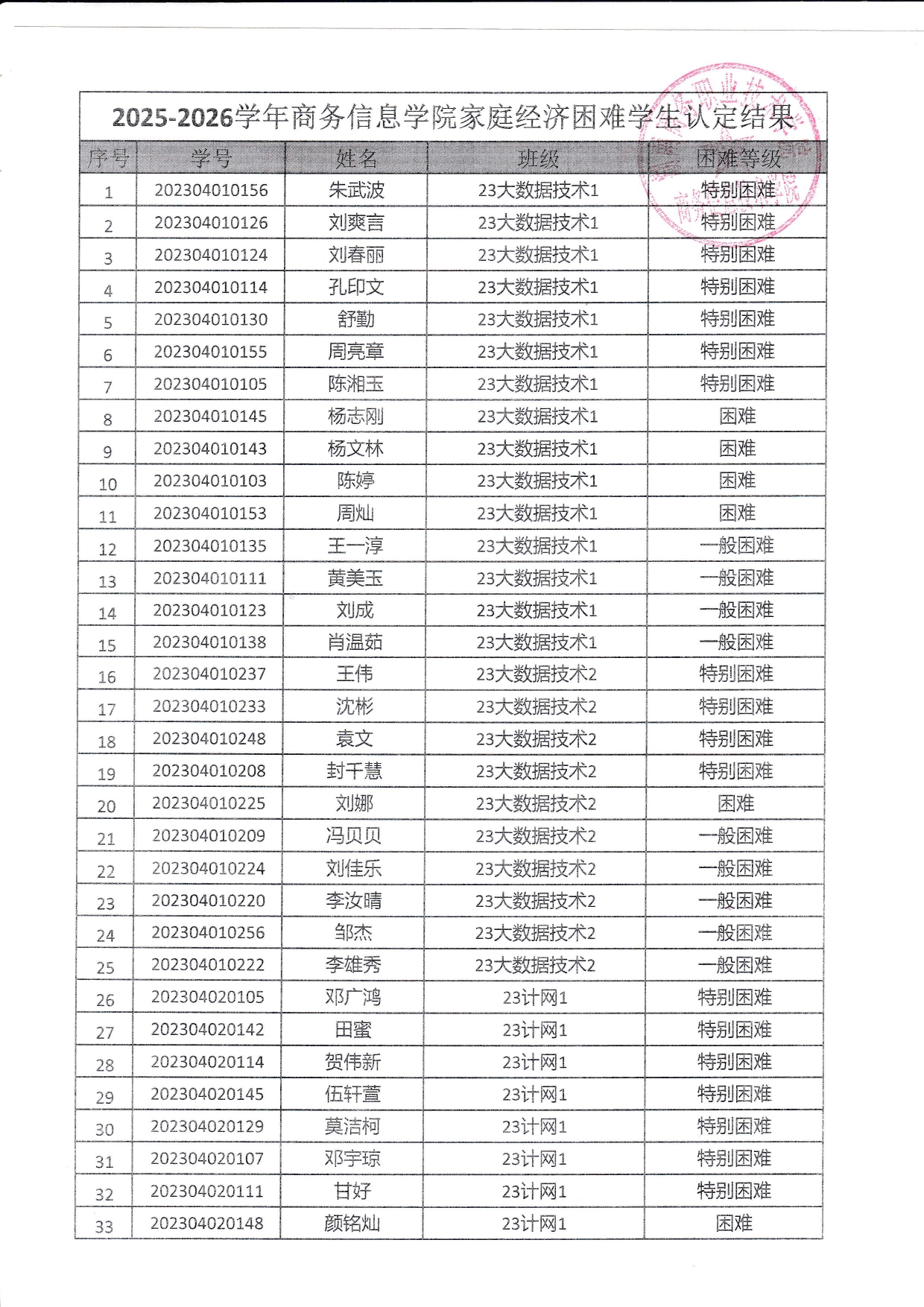 关于商务信息技术学院2025-2026学年 家庭经济困难学生认定结果的公示