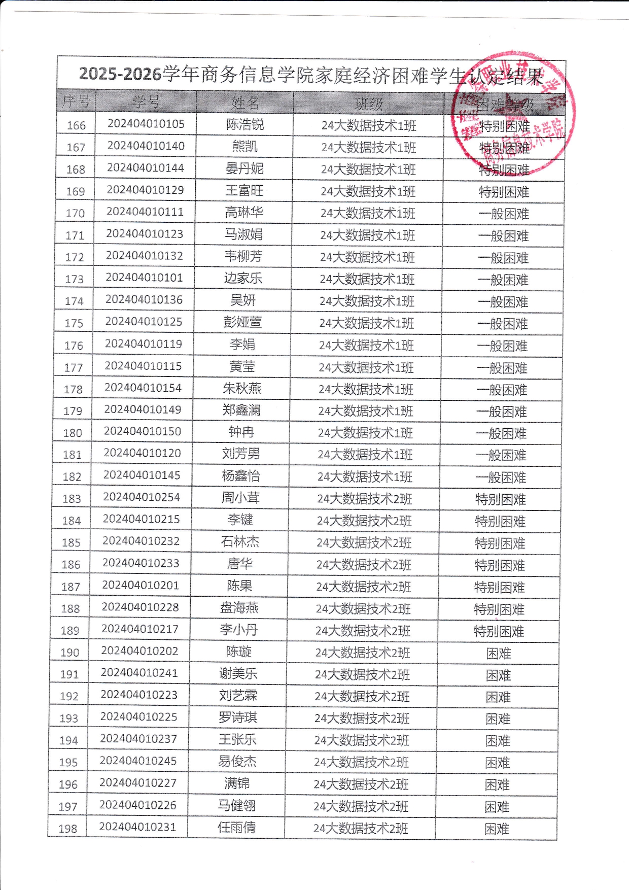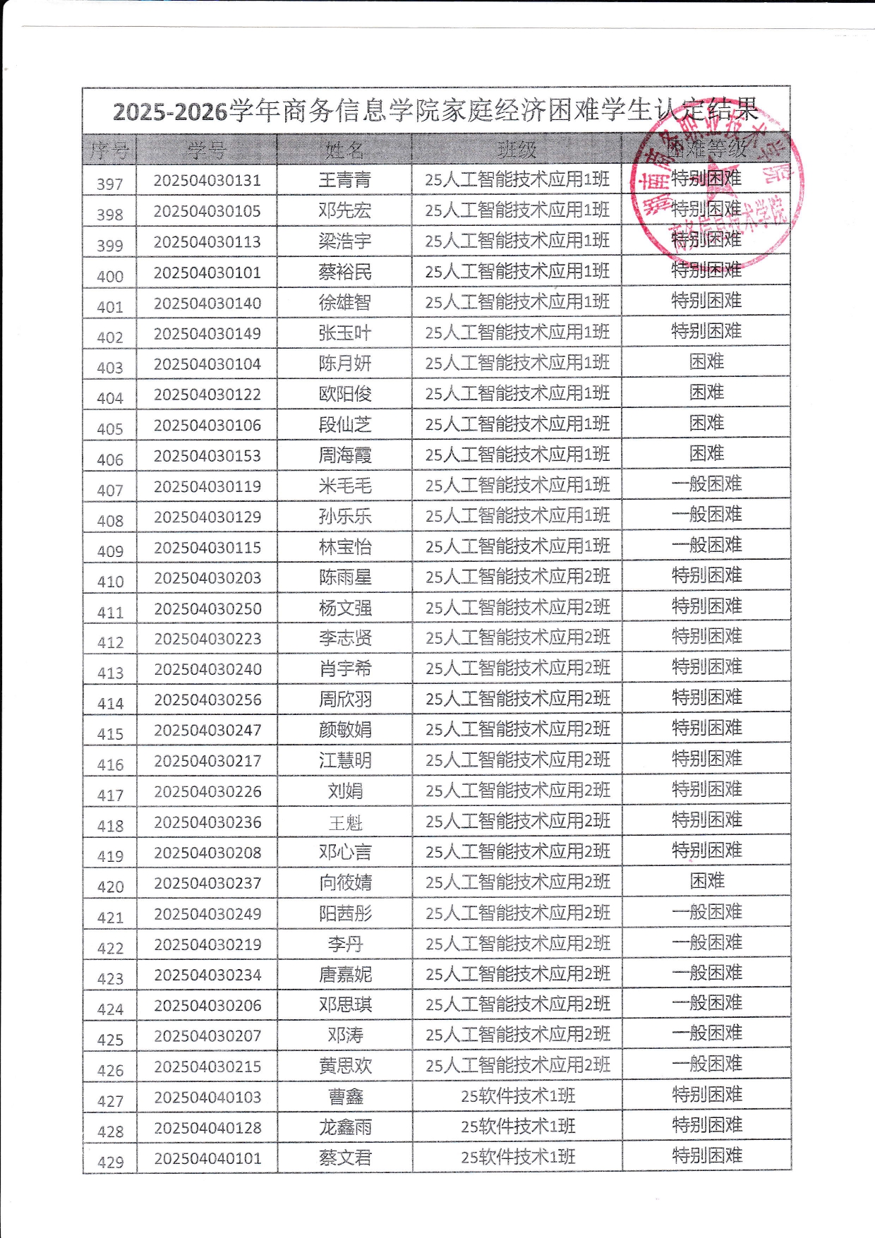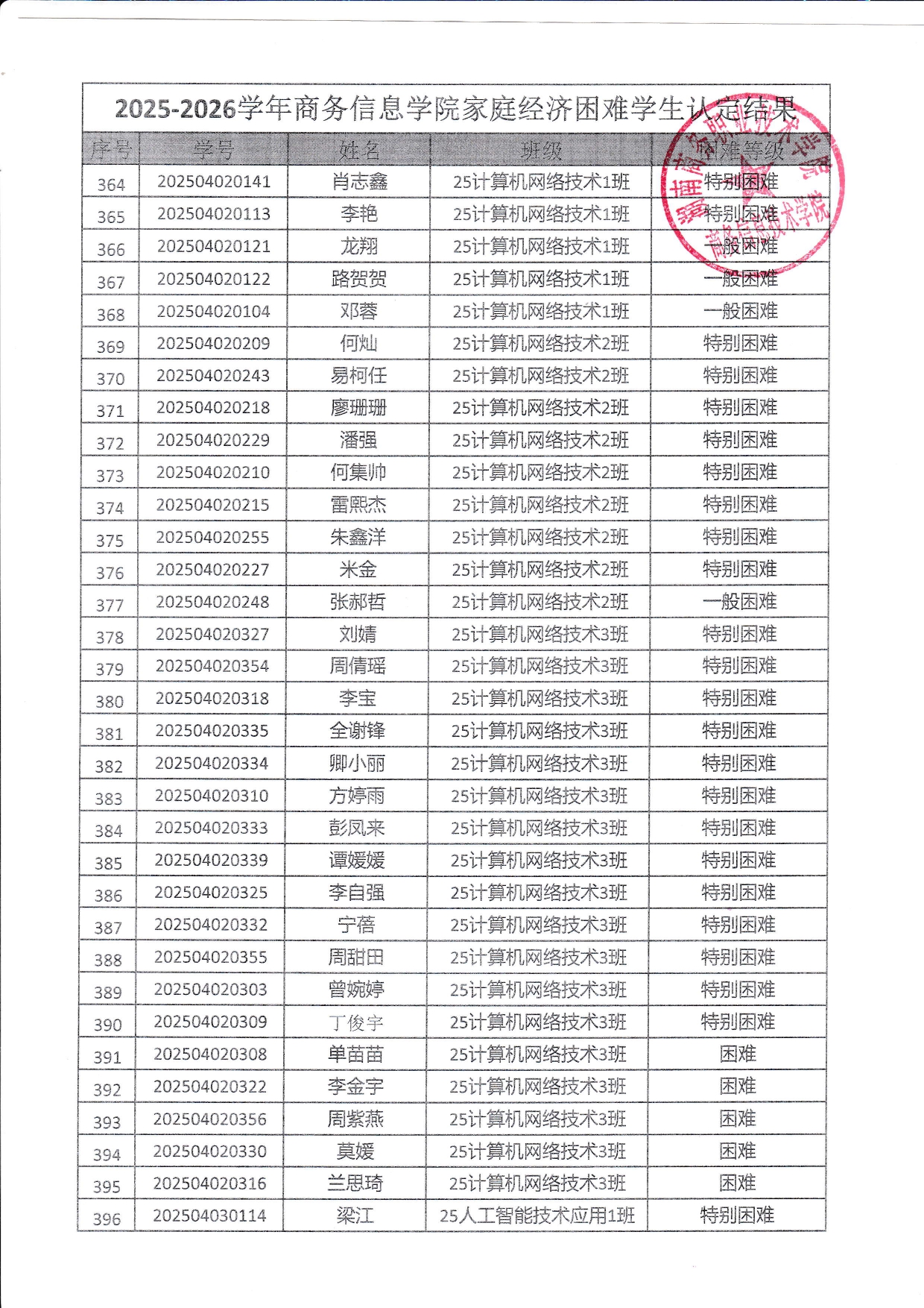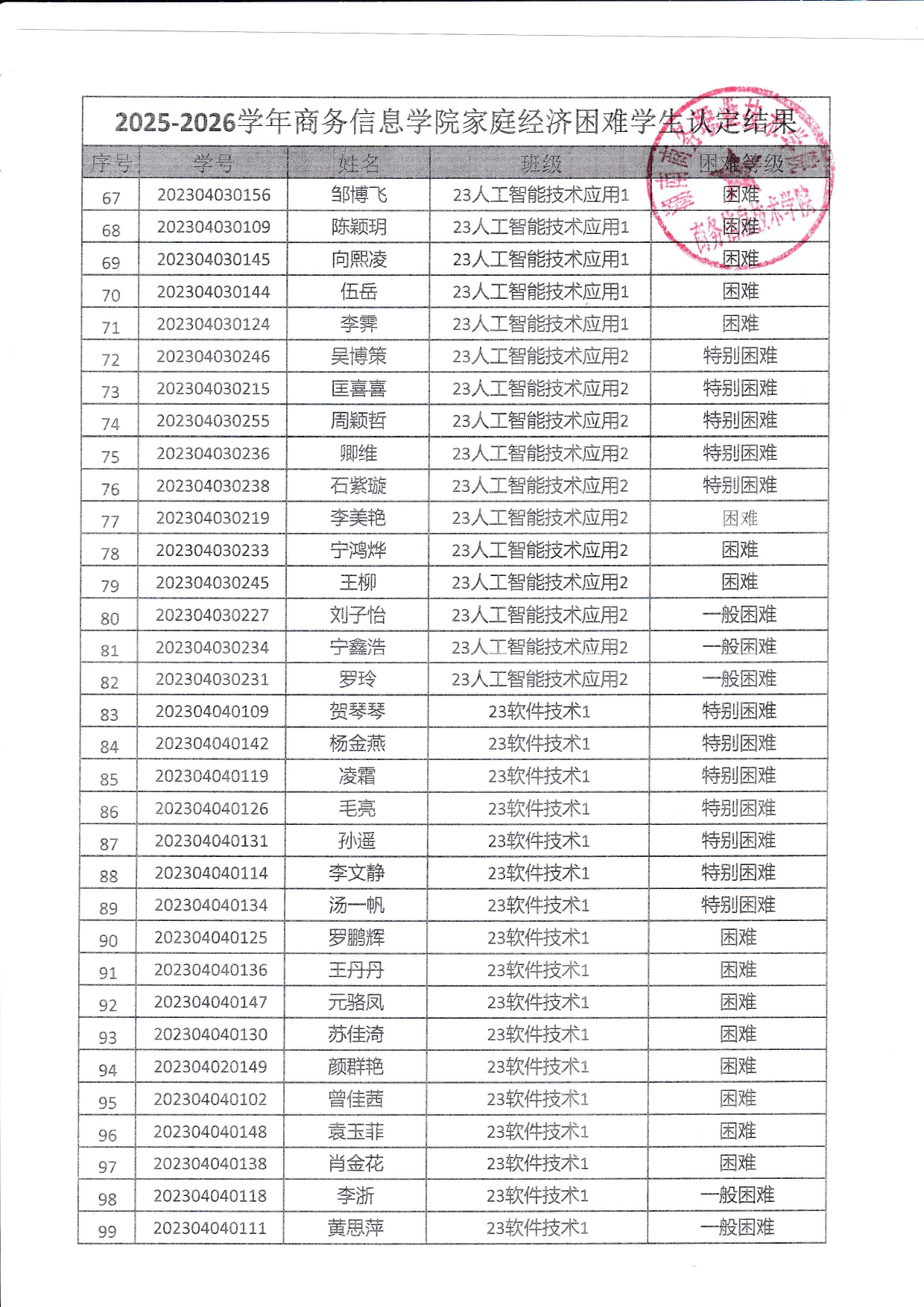关于商务信息技术学院2025-2026学年 家庭经济困难学生认定结果的公示