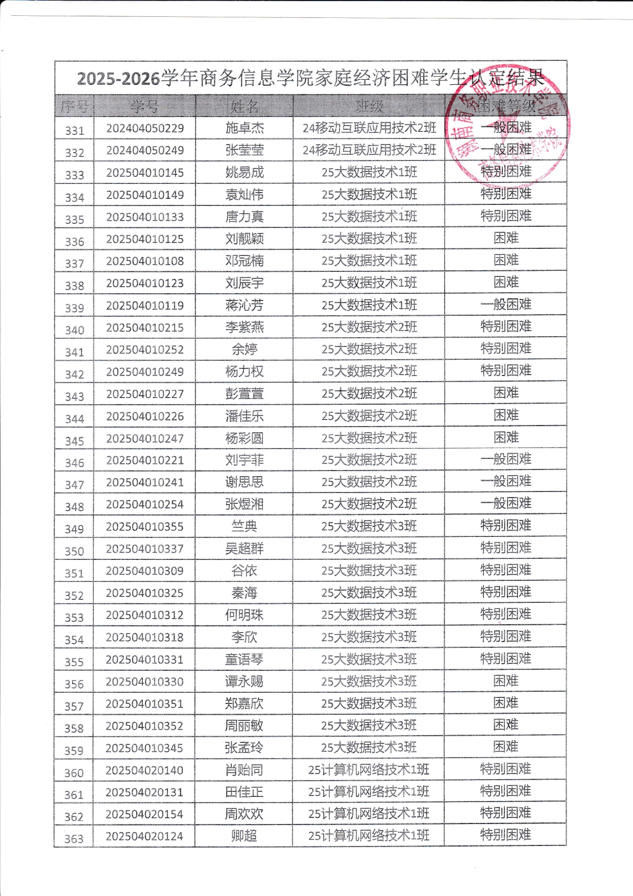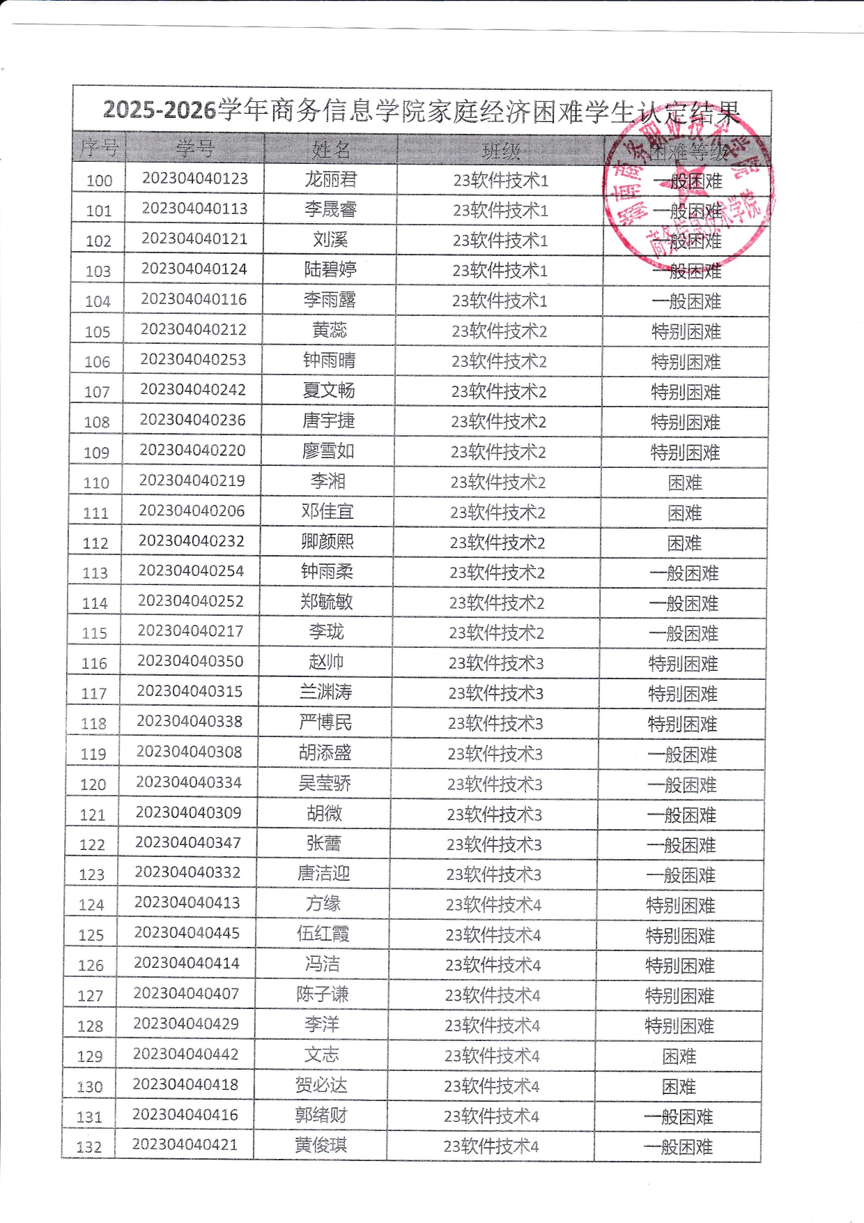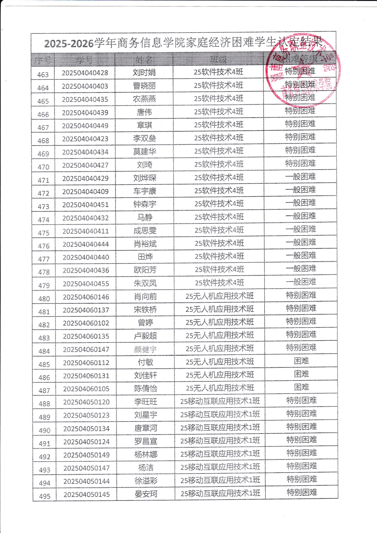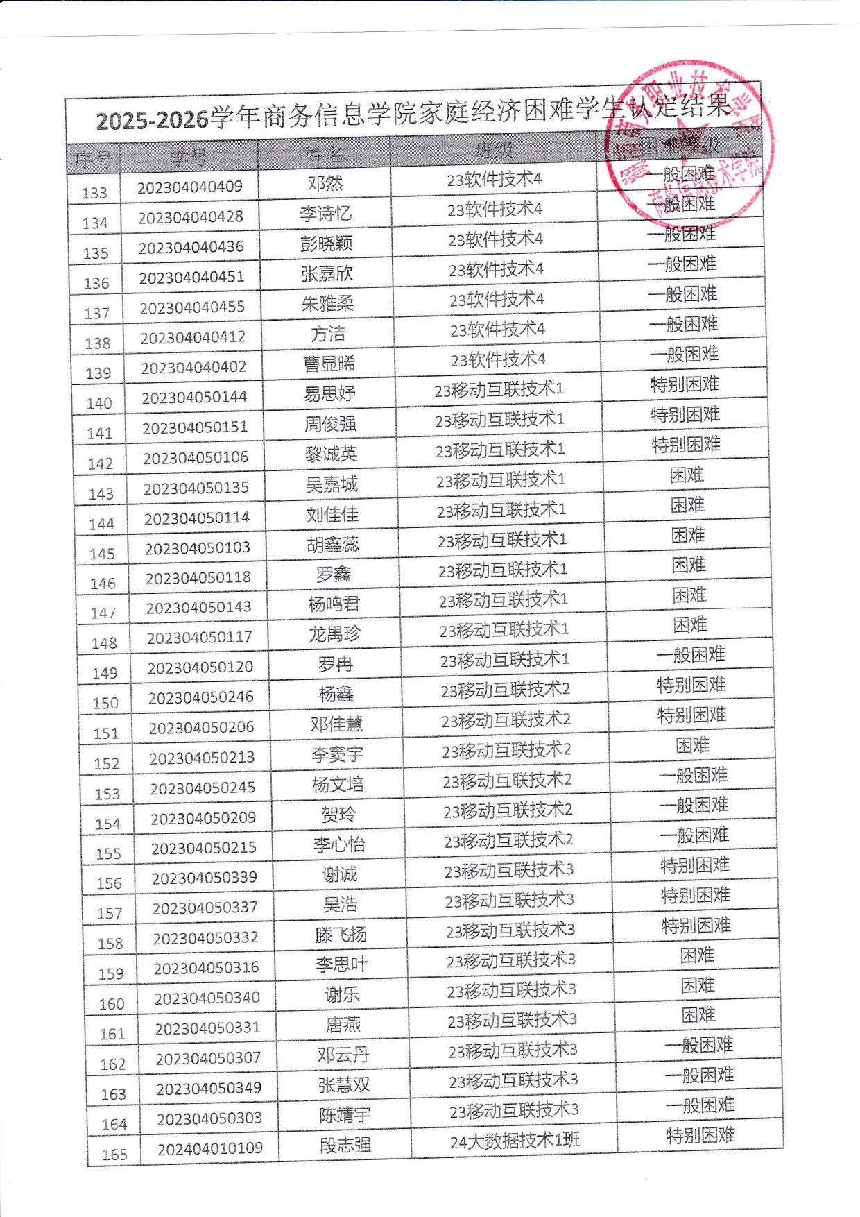 关于商务信息技术学院2025-2026学年 家庭经济困难学生认定结果的公示