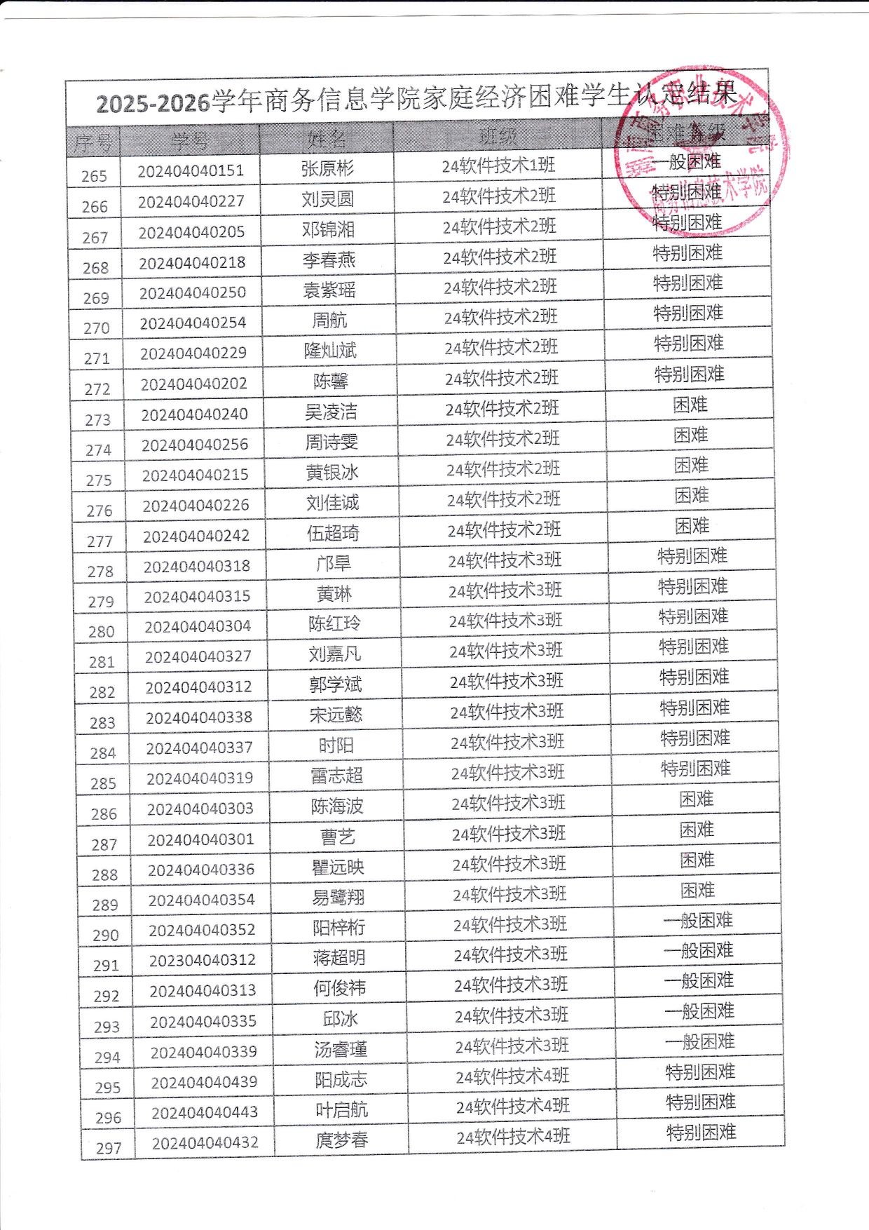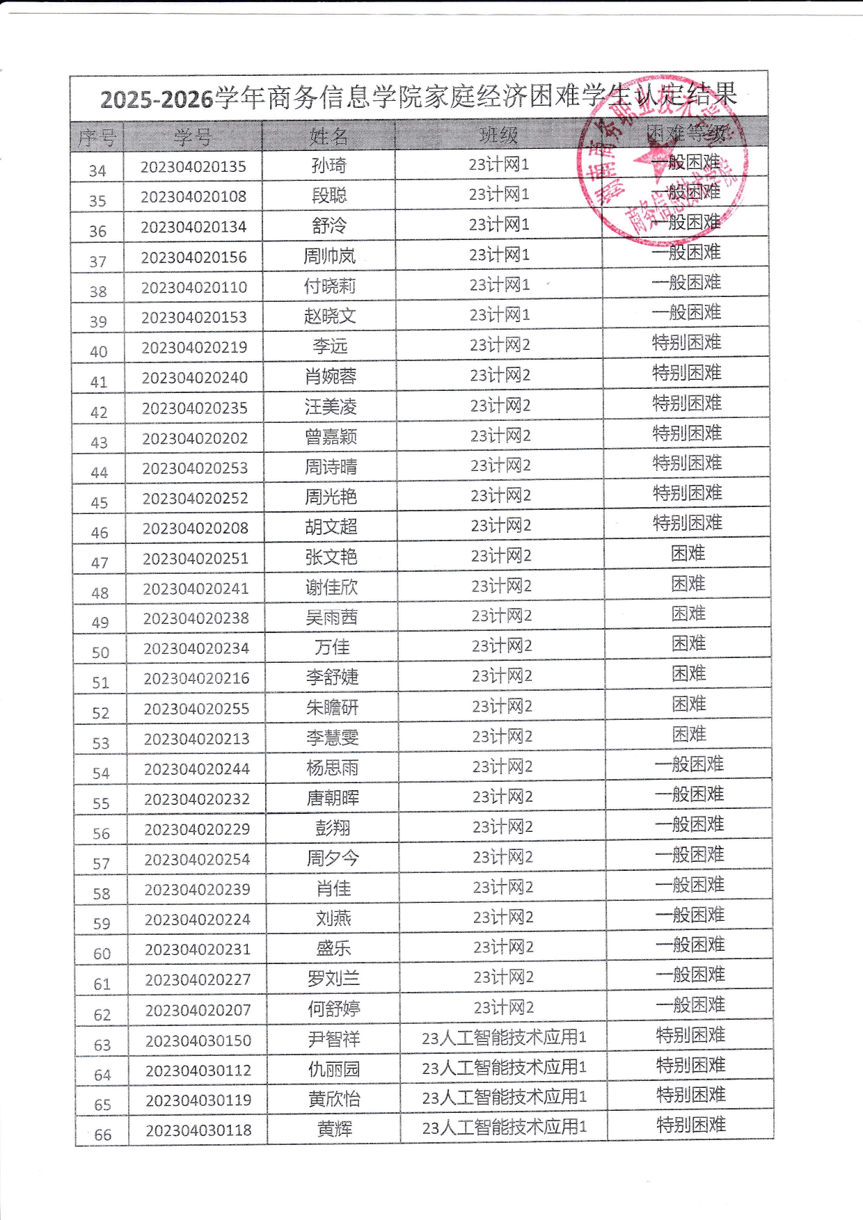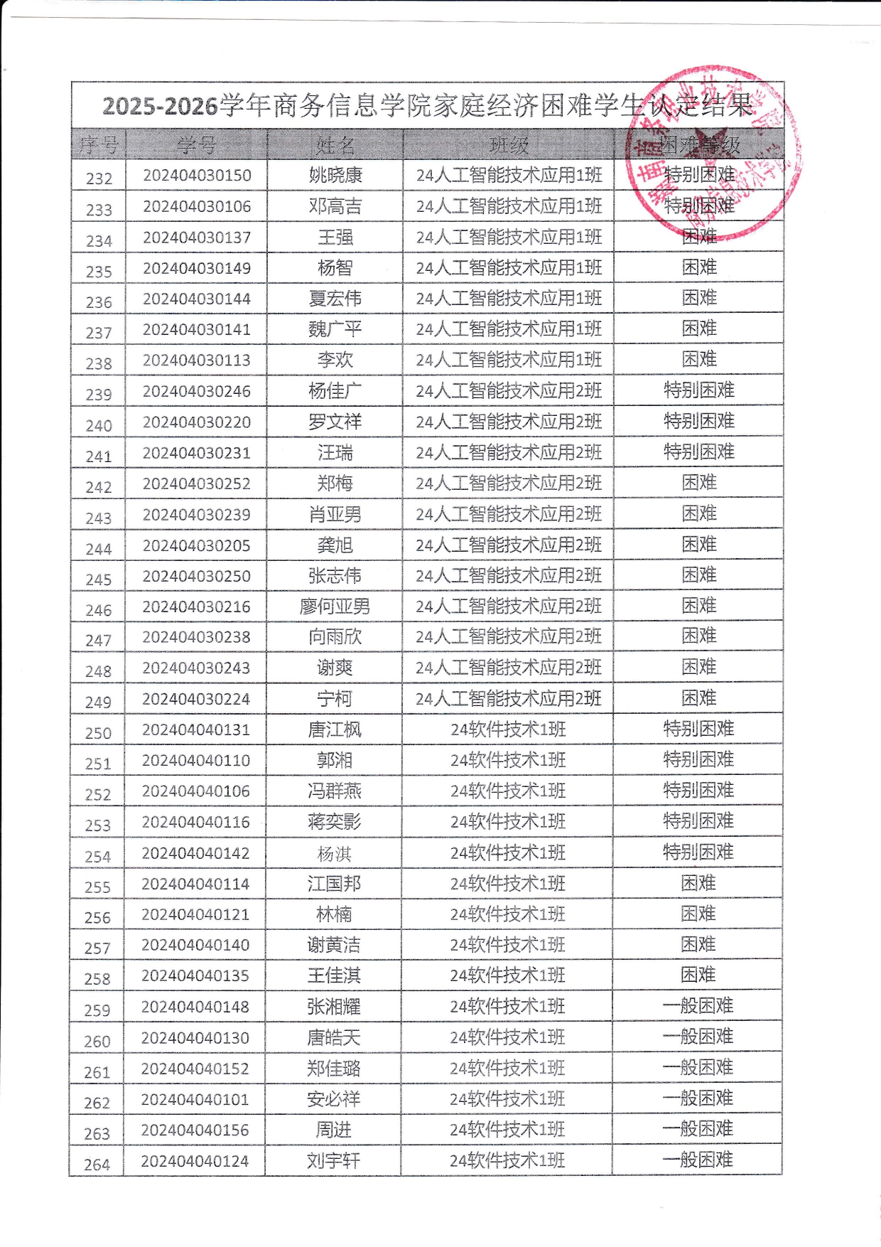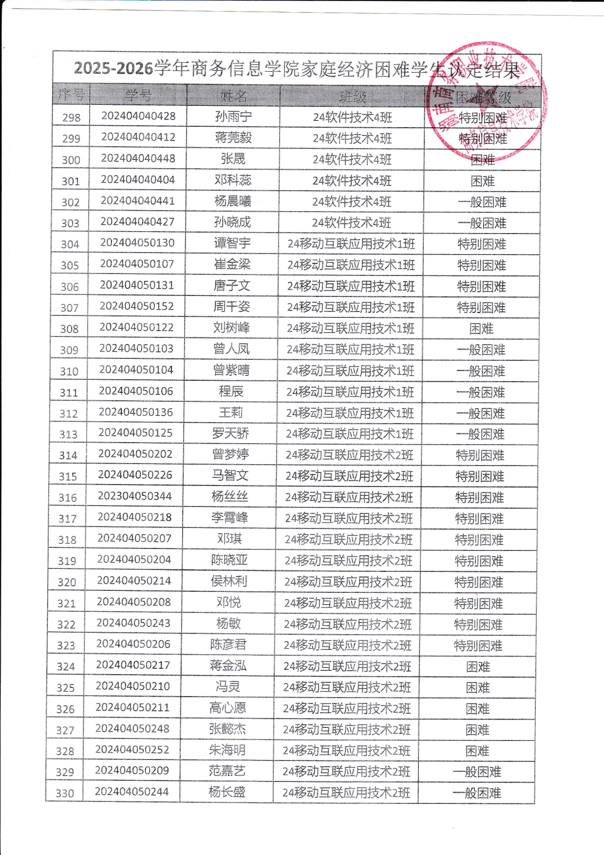 关于商务信息技术学院2025-2026学年 家庭经济困难学生认定结果的公示