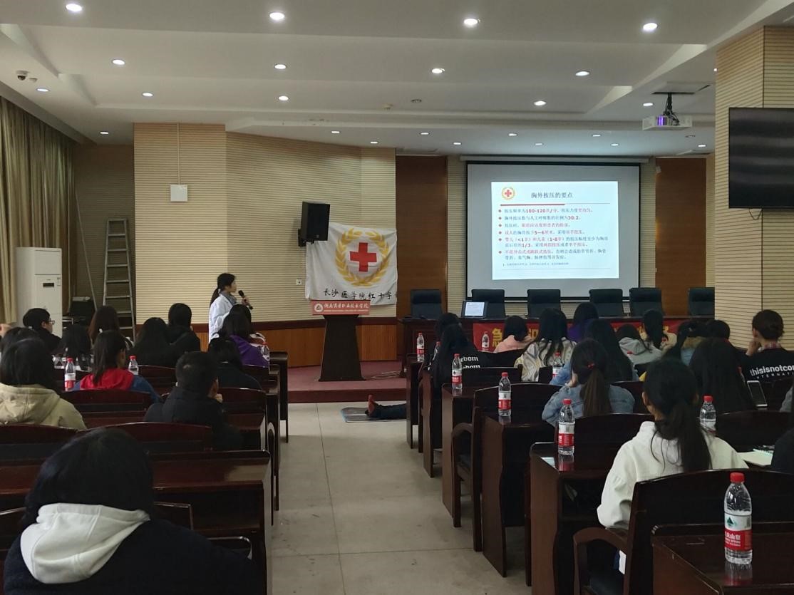 讲座首先由长沙医学院红十字会的培训人员对CPR进行理论讲述,让学生对CPR有了初步了解,同时强调抢救中珍贵的“黄金四分钟”的重要性以及注意事项。随后由长沙医学院红十字会培训人员进行了假人演练,并且请学生参与实操。在培训人员的悉心指导下同学们详细了解了救助过程中的流程。