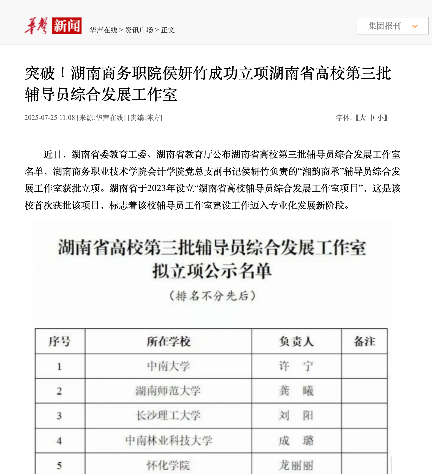 华声在线报道——突破!湖南商务职院侯妍竹成功立项湖南省高校第三批辅导员综合发展工作室