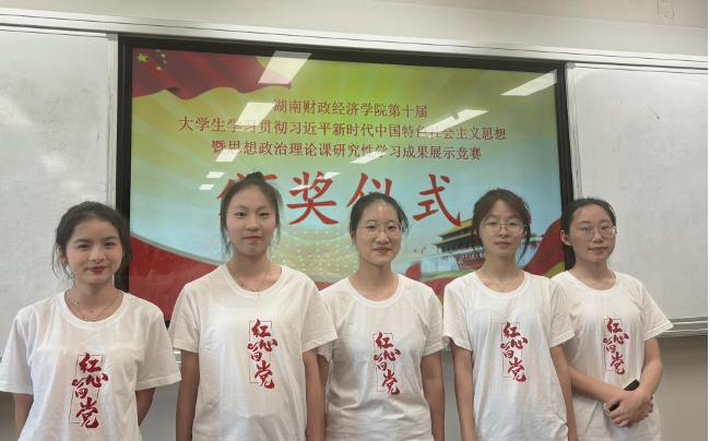 “接天莲叶碧似霞,乡村振兴显风华”一句话让沉寂的现场活跃起来,开启了一场准备已久的大学生思政研究性学习成果展示。备赛期间,在马克思主义学院邓艳君院长、肖彬副院长的悉心指导下,五名学生积极准备。写演讲稿,制作PPT,反复修改,每个人都用心准备自己负责的内容。团队成员互相鼓励彼此,一遍又一遍地排练展示,最终“功夫不负有心人”,在现场决赛中斩获特等奖,将代表湖南财政经济学院参加湖南省赛。