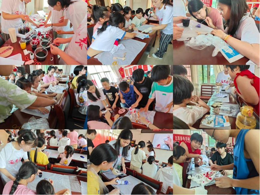 尤为值得一提的是,团队还特别融入了中华非物质文化遗产相关课程——扎染课,楚怡青春行团队充分融合了理论与实践,采用“讲授+示范+实操”的教学模式。在理论讲授环节,学生们不仅学习了扎染的历史渊源、技艺特点、美学价值等基本知识,还通过视频、图片、实物等多种媒介,直观感受了扎染艺术的魅力。课堂上志愿者老师带领学生们现场演示扎染的复杂工序,从选布、设计、扎结、染色到拆结、清洗、晾干,每一步都凝聚着匠人的心血与智慧。