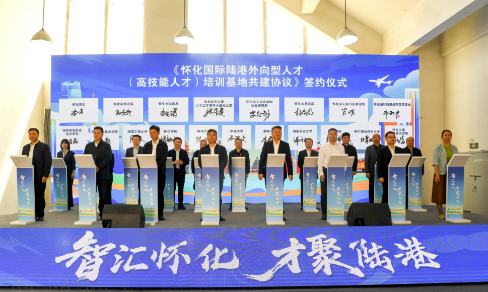 本次活动由怀化市委、市政府指导,市委组织部、市人社局主办,聚焦外向型、高技能人才培养,搭建政府、园区、高校、企业多方联动育人平台。仪式上,我校参与第二轮重点签约,与怀化市人社局、财政局、商务局、怀化海关、怀化国际陆港经开区等单位携手,共建高技能人才培训基地,构建长效协同育人机制,为怀化国际陆港高质量发展提供坚实人才支撑。