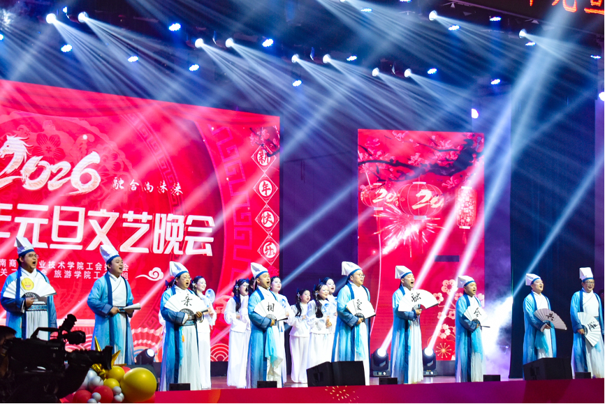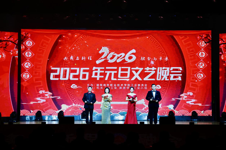 12月30日晚,湖南商务职业技术学院洋溢着喜庆欢腾的节日氛围,“共舞启新程·融合向未来”2026年元旦文艺晚会在师生热切期待中盛大启幕。学校领导、两校区师生代表欢聚一堂,共赏精彩演出,喜迎崭新一年。本次晚会通过湖南教育电视台进行全程现场直播,吸引线上逾万名观众与校友共同观看、互动祝福,凝聚起一场跨越时空的团圆盛会。湖南省教育工会副主席朱冠星、普教部部长肖艺婕及部分校企合作单位代表受邀出席晚会。