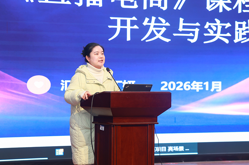 上午的培训延续教学与学管双线并行的模式。教学线组织开展“说课程”专题展示,周若谷、吴可佳、丁妍、曾妙四位教师分别围绕《大数据技术应用基础》《大学英语》《直播电商》《跨境电子商务》课程,从课程定位、内容重构、教学方法、资源建设、考核评价等方面进行了精彩阐述。展示聚焦“五金”建设要求,积极融入AI赋能的教学创新实践,体现了课程与产业需求对接、与人才培养目标契合的改革探索,为深化课堂教学改革提供了鲜活范例。