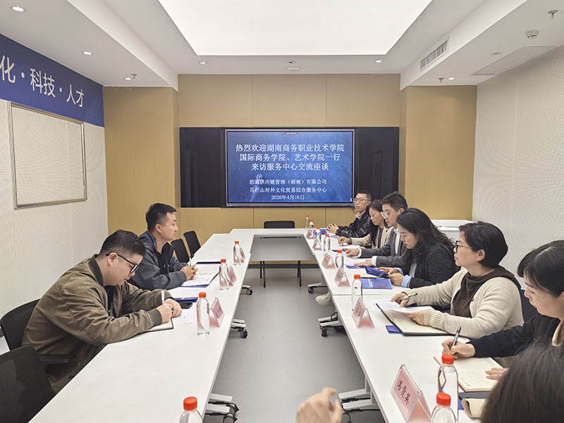 为主动对接文化“走出去”战略和数字文化贸易发展趋势,进一步拓展专业建设视野,深化校地协同与资源链接,4月16日,湖南商务职业技术学院艺术学院、国际商务学院一行赴马栏山对外文化贸易综合服务中心开展专题调研交流,围绕文化出海、数字文化贸易、人才培养和实践教学等内容进行实地考察与座谈研讨。