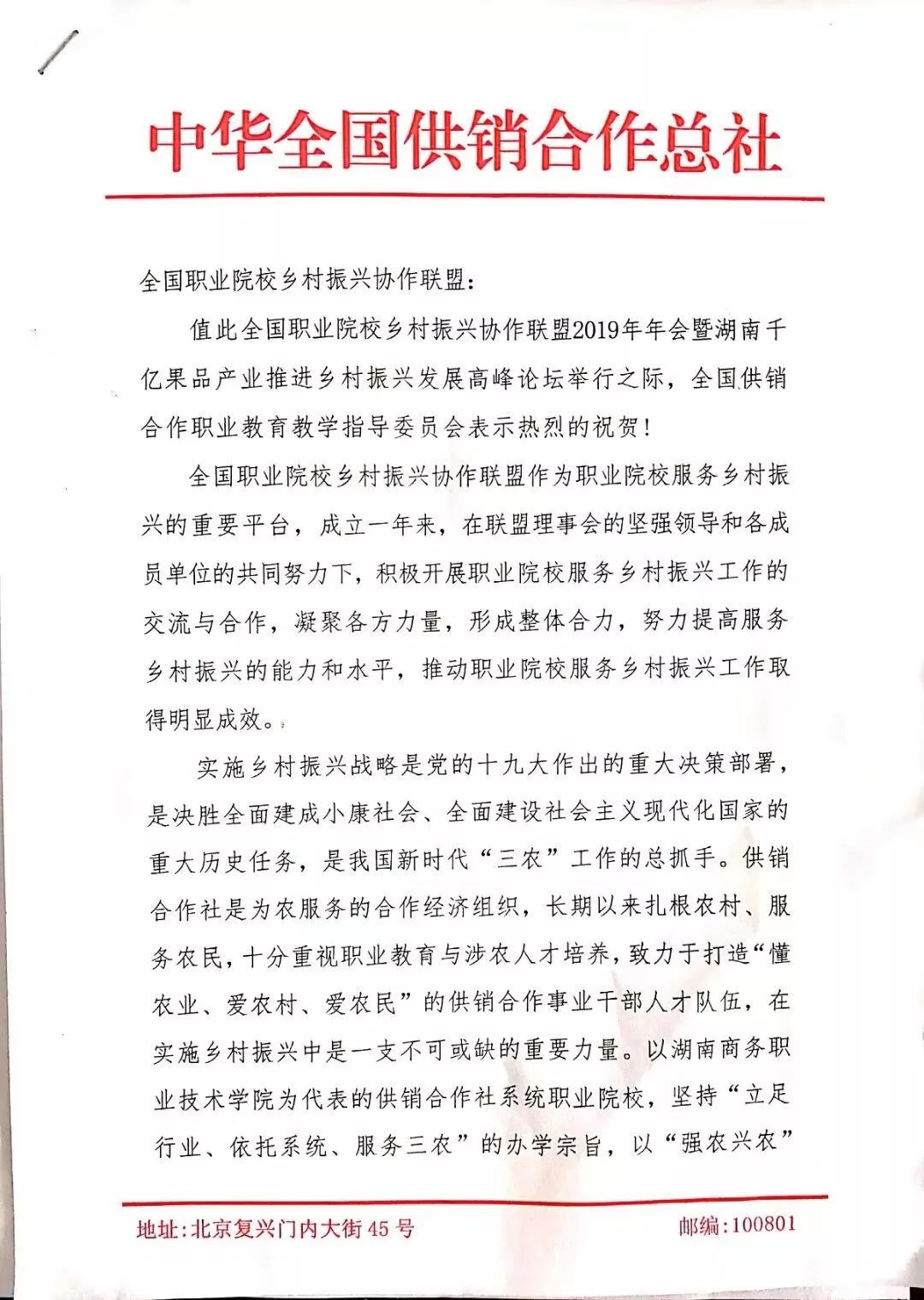 中华全国供销合作总社祝贺全国职业院校乡村振兴协作联盟2019年年会暨湖南千亿果品产业推进乡村振兴发展高峰论坛成功举办的贺信