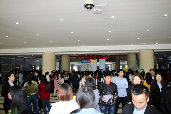 招聘会现场人头攒动,2000余名学生寻找着适合自己的岗位,有的已向自己心仪的公司投递了简历,还有不少毕业生与招聘单位达成了初步就业意向。
